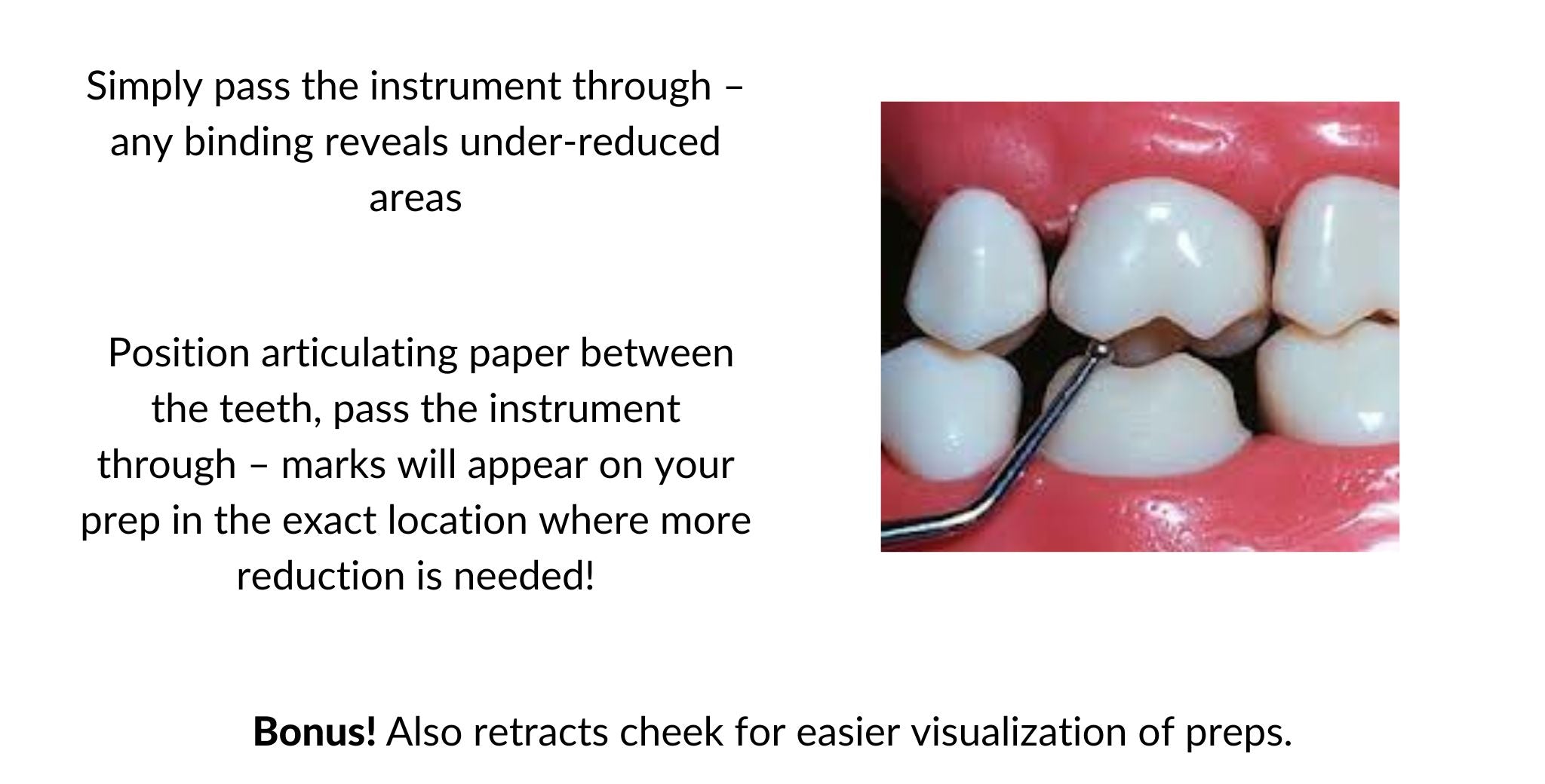 Este instrumento de preparación de coronas permite al operador verificar tanto la reducción oclusal (extremo de 2 mm) como los márgenes cerámicos (extremo de 1,5 mm). Ahora puede medir sus preparaciones de corona con exactitud y precisión.