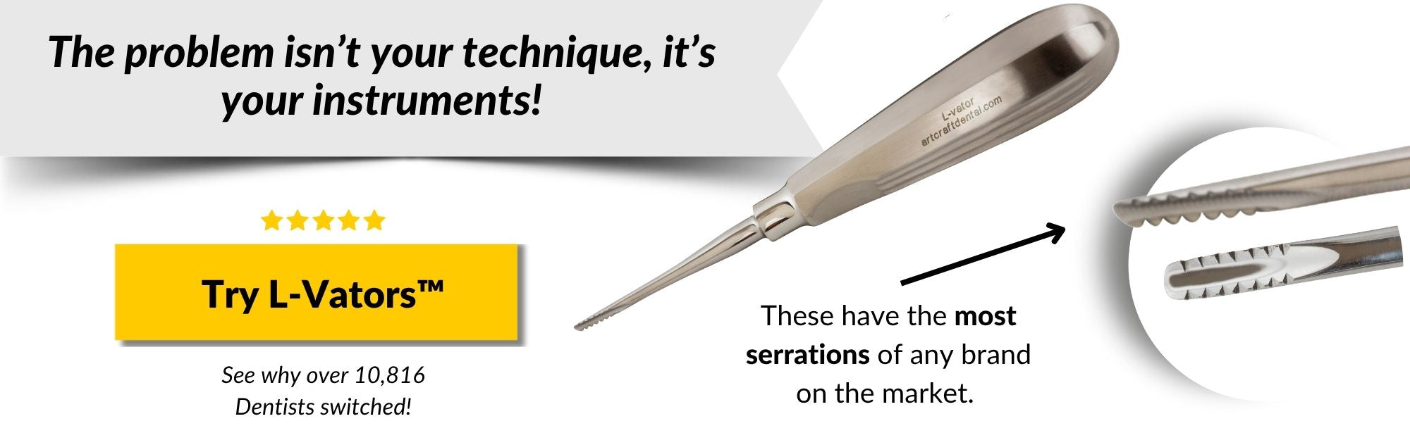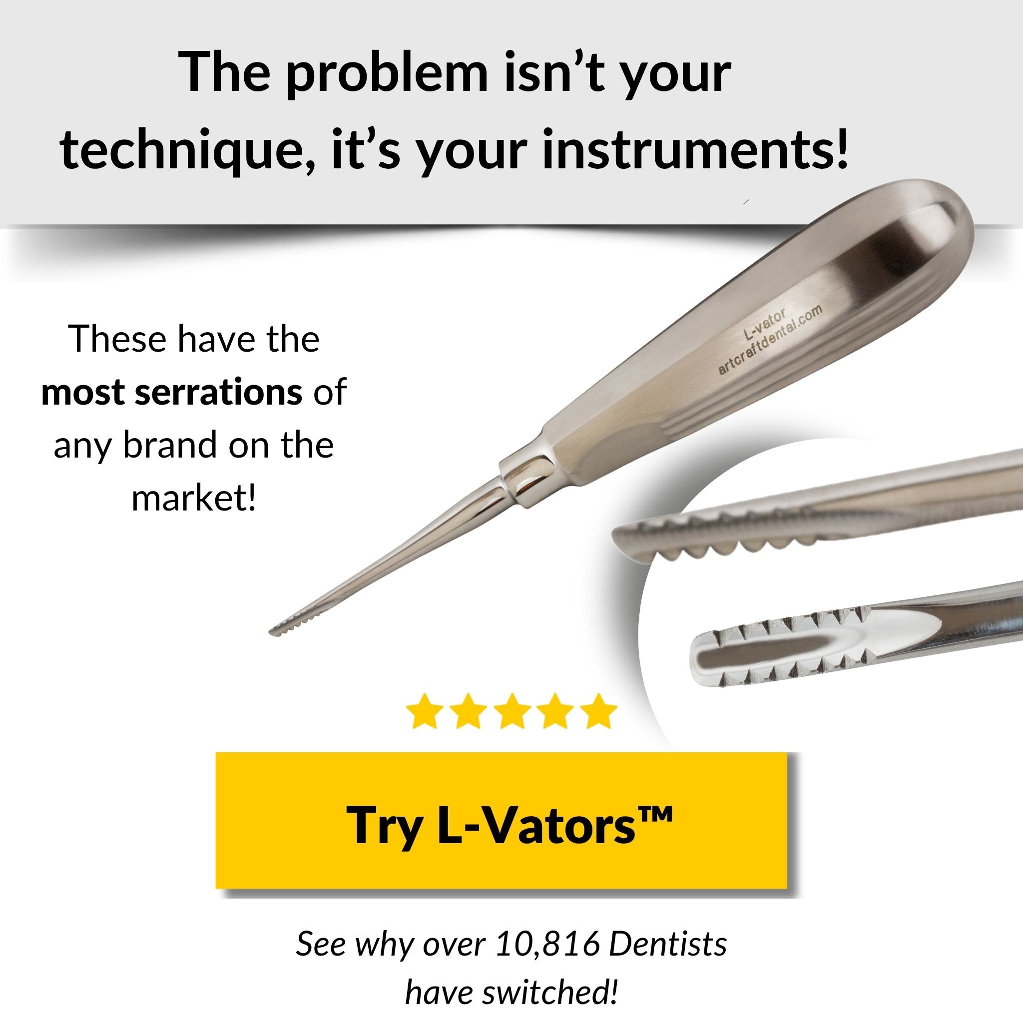 Single piece construction means that our L-vators™ are durable! Often times you will see cheap elevators on the market with soldered or glued on separate pieces - this creates weak points in the instruments which can cause it to break mid procedure!