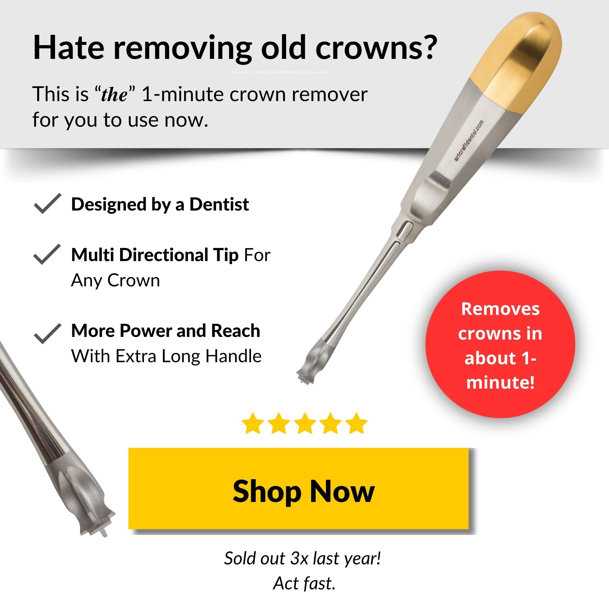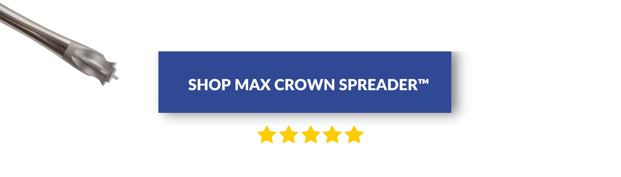 First, use the Max Crown Spreader™ to remove an old crown needing replacement in about one minute. At the next appointment, use Tempoff® to quickly and predictably remove your temporary — no need to cut the temporary off or anesthetise the patient. Imagine the time you can save with this bundle!