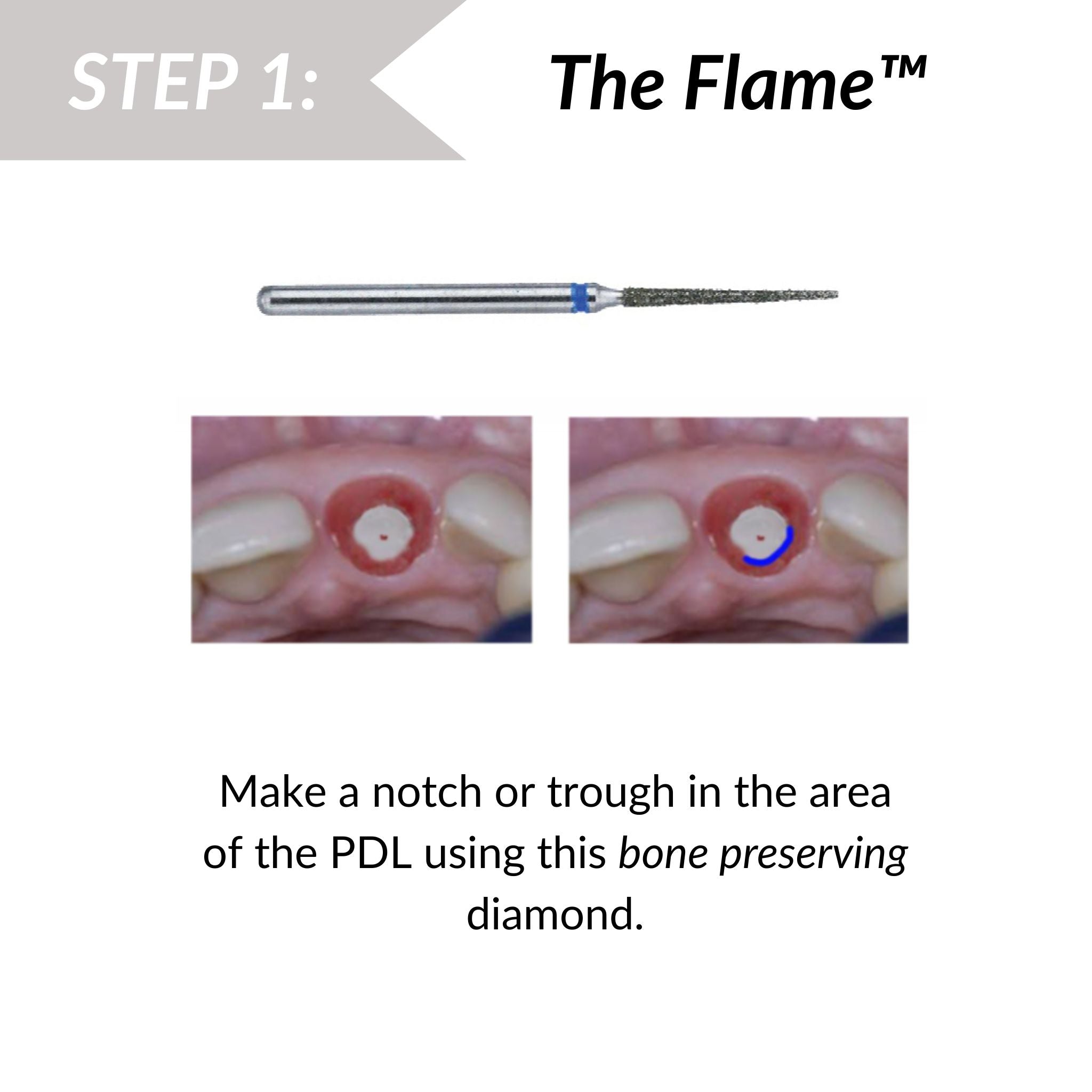 The Spear Elevator (center instrument) has an ergonomic palm handle design for more power. The smaller Right and Left root tip picks allow for better access to deep, broken root tips. Designed to fit perfectly into the slot made with our Flame™ Diamond.
