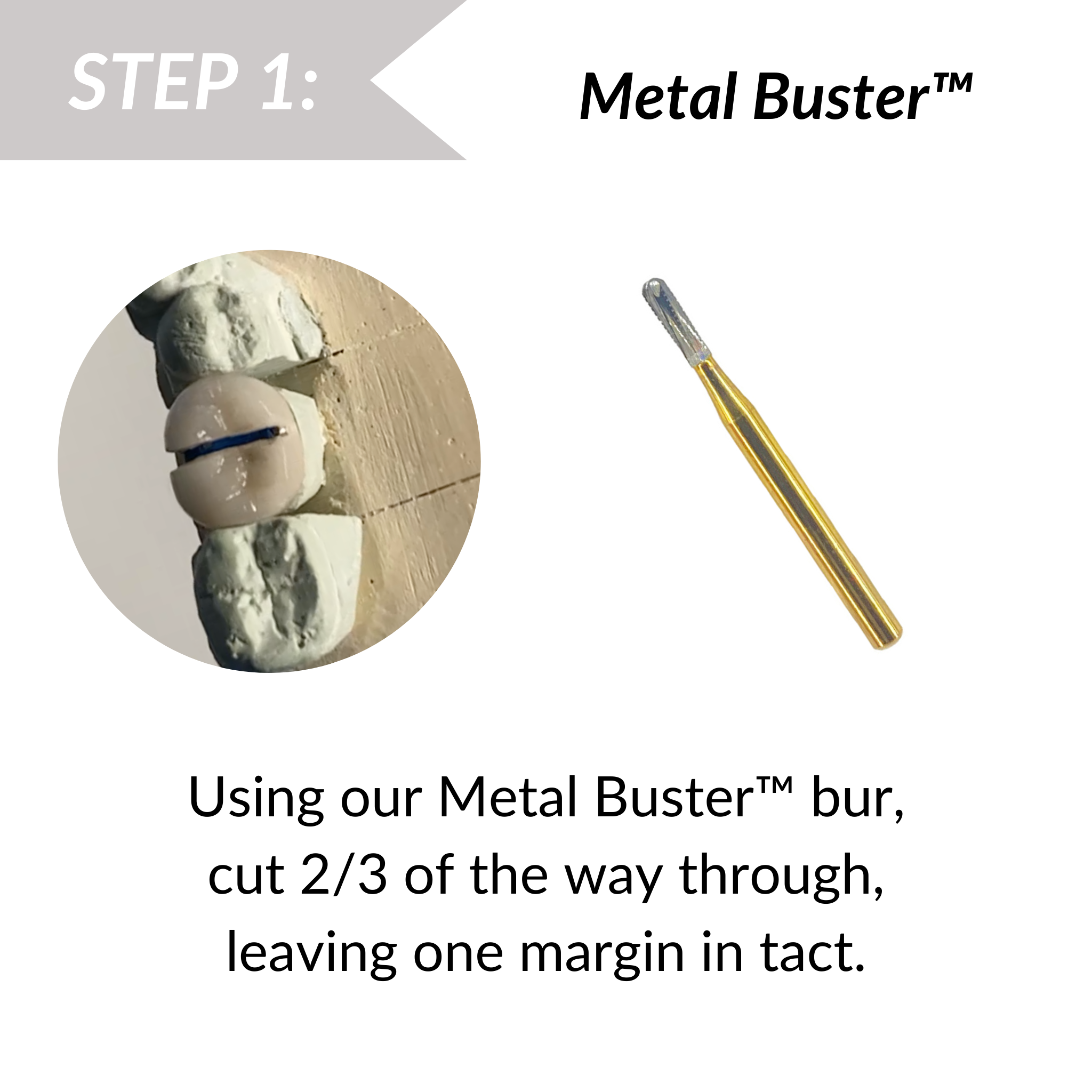 Using our Metal Buster™ Bur, cut 2/3 of the way through, leaving one margin in tact. Spring it open in 2-3 seconds! Bonus! This also pairs well with our Zirconia Buster™.