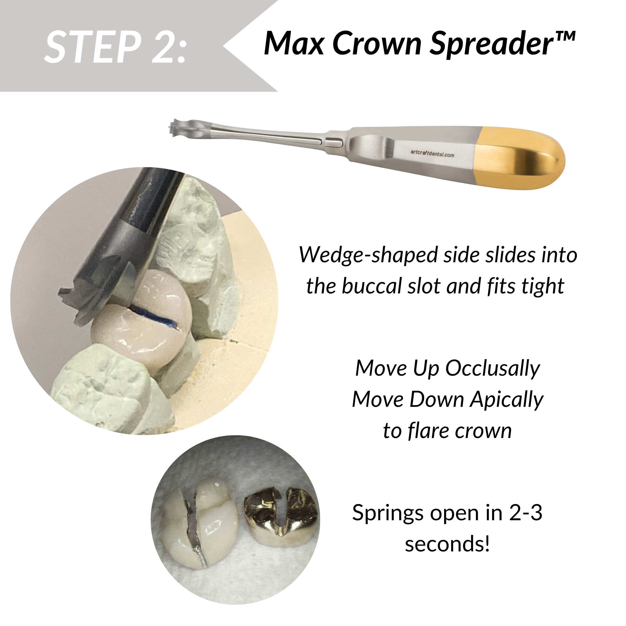 First, use the Max Crown Spreader™ to remove an old crown needing replacement in about one minute. At the next appointment, use Tempoff® to quickly and predictably remove your temporary — no need to cut the temporary off or anesthetise the patient. Imagine the time you can save with this bundle!